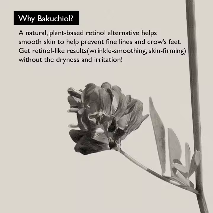 - Bakuchiol – Potente activo vegetal antiaging, mejora firmeza y suaviza arrugas.